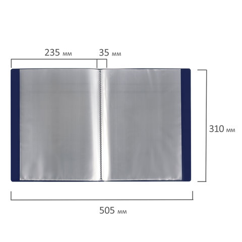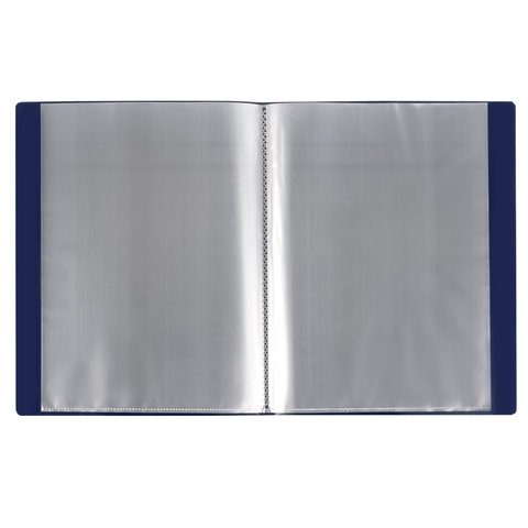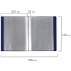 Для маркировки содержимого на корешок наклеена этикетка. Папка изготовлена из пластика толщиной 0,7 мм с антибликовой фактурой, а ширина корешка составляет 35 мм. Содержит 100 вкладышей, позволяющих хранить документы формата А4 и обеспечивающих их надежную защиту от попадания влаги, пыли и прочих повреждений.