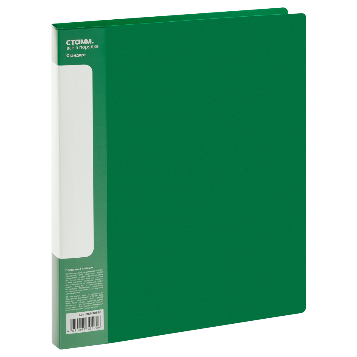 Папка на 2 кольцах СТАММ "Стандарт" А4, 25мм, 700мкм, пластик, зеленая, ММ-30590, 355276