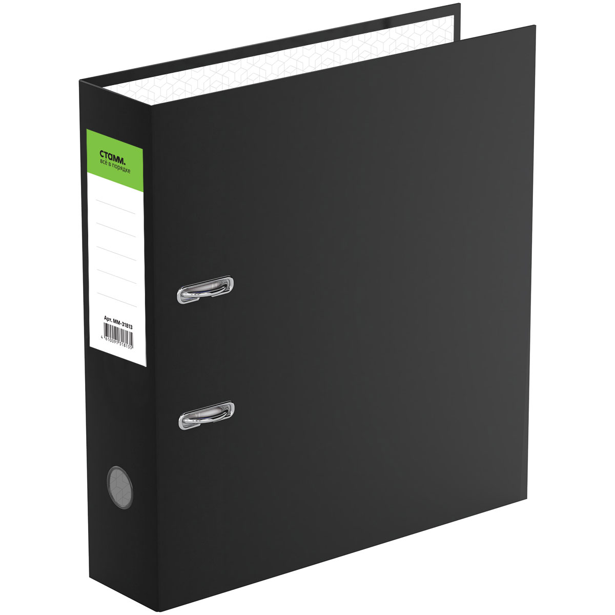 Папка-регистратор СТАММ серии «Офис» формата А4 с арочным механизмом идеальна для создания архива и экономии офисного пространства. Размер папки – 320*290*70 мм. Папка вмещает до 550 листов. Ширина корешка составляет 70 мм. Минималистичный классический дизайн: папка выполнена в насыщенном чёрном цвете. Изготовлена из жесткого износостойкого картона с односторонним покрытием из бумвинила. Внутреннее покрытие выполнено из бумаги. Папка имеет арочный механизм из качественного металла. Конструкция разработана с учетом всех особенностей эксплуатации. Эргономичное отверстие в корешке помогает быстро снять папку с полки. На корешке папки есть ярлык для маркировки. На внутренней стороне обложки есть поле для записи.