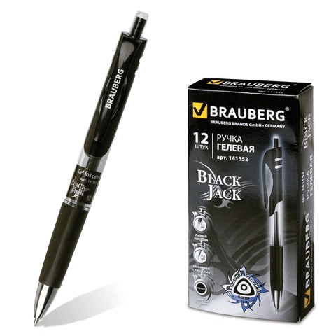 Ручка гелевая BRAUBERG автомат. "Black Jack", корпус трехгранный, рез. держ., черная, подходит для ЕГЭ, 141552