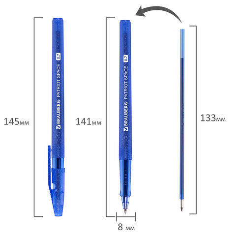 Шариковая ручка BRAUBERG "Patriot Space" обеспечивает комфортное и качественное письмо. Имеет круглый прозрачно-синий корпус с блестками. Цвет чернил синий. Сменный стержень длиной 133 мм со стандартным наконечником позволит использовать ручку максимально долго. Диаметр пишущего узла, равный 0,7 мм, создает линию письма, равную 0,35 мм.