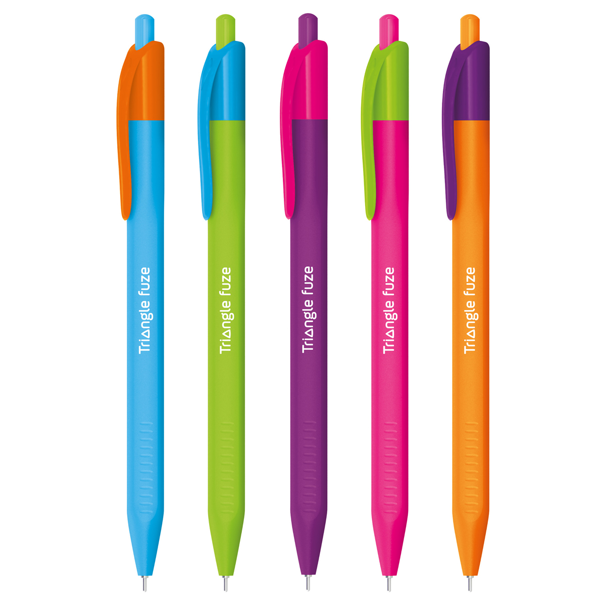 Шариковая автоматическая одноразовая ручка Berlingo Triangle Fuze RT в ярком контрастном дизайне. Корпус эргономичной трёхгранной формы, рифление в зоне захвата и пластиковый клип создают дополнительный комфорт при письме. Бархатистое покрытие корпуса Soft touch обеспечивает особое удобство при использовании ручки. Диаметр пишущего узла составляет 0,7 мм, толщина линии письма – 0,5 мм, а длина письма – 820 м. Уникальная запатентованная технология Smart Ink обеспечивает лёгкое и приятное письмо, за счёт использования чернил пониженной вязкости и инновационных материалов шарика, пишущего узла и его специальной конструкции. Инновационные компоненты, используемые для изготовления шарика пишущего узла (карбид вольфрама), обеспечивают долговечность и стабильность качества письма. • Технология: Smart Ink; • Цвет чернил: синий; • Толщина линии письма: 0,5 мм; • Длина письма: 820 м; • Цвет корпуса: ассорти.