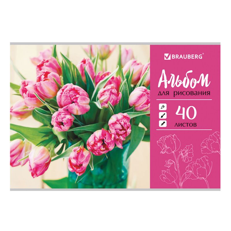 Альбом для рисования А4 40 листов, скоба, обложка картон, BRAUBERG "ЭКО", 202х285 мм, "Тюльпаны", 105088