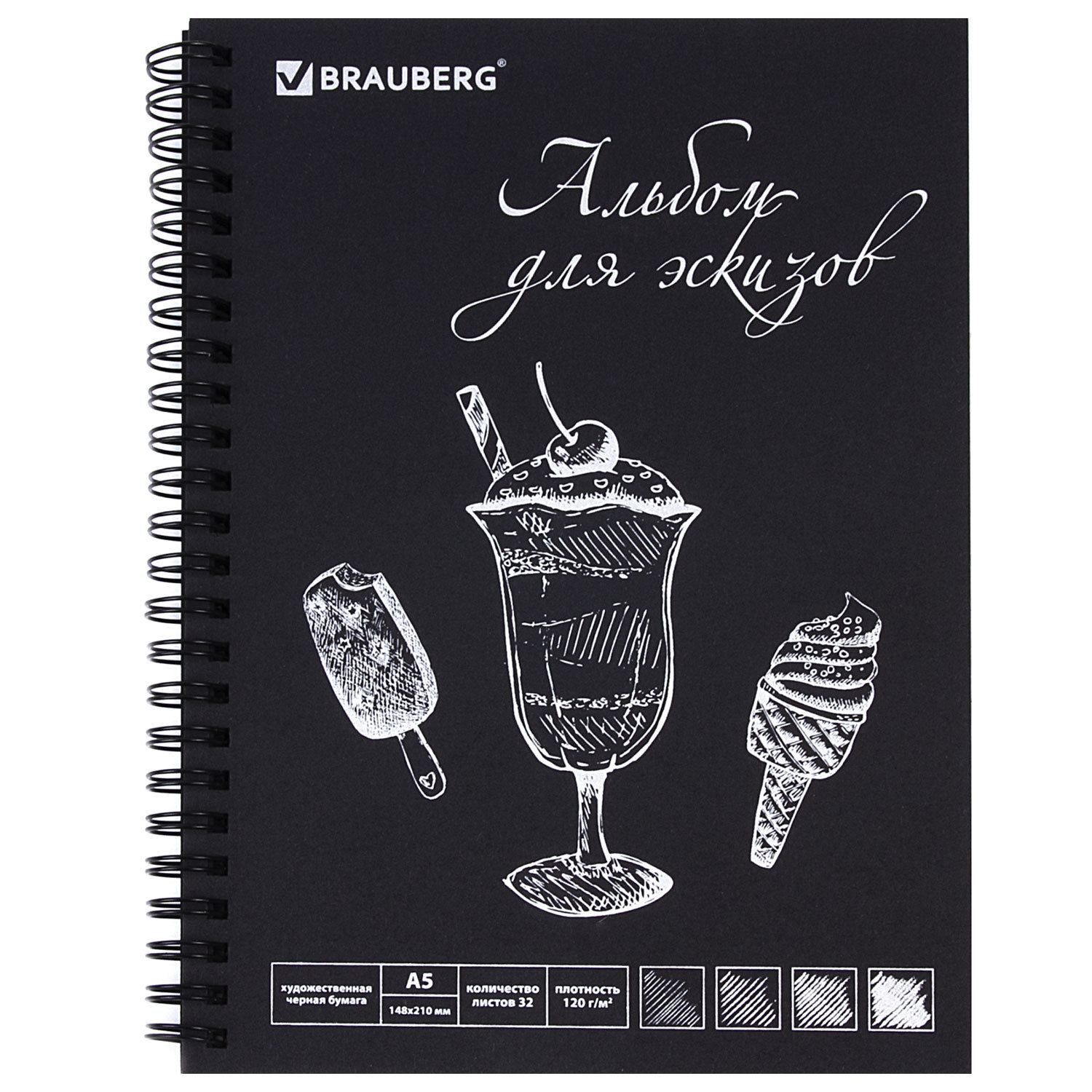 Скетчбук, черная бумага 120 г/м2, 148х210 мм, 32 л., гребень, BRAUBERG ART "CLASSIC", 128952