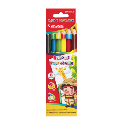 Карандаши цветные утолщенные BRAUBERG, 6 цветов, трехгранные, картонная упаковка, 180835