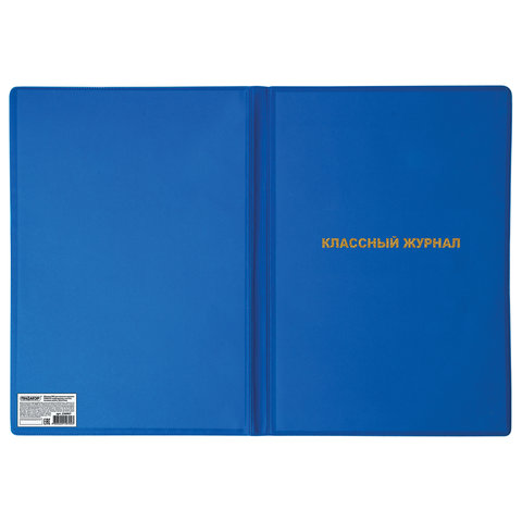 Непрозрачная плотная обложка ПИФАГОР синего цвета с золотым тиснением для классного журнала изготовлена из картона плотностью 235 гр/м2 и поливинилхлорида (ПВХ) толщиной 250 мкм. Размер 305х475 мм. Традиционная, с двумя клапанами, без возможности регулировки по ширине.