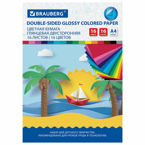 Цветная бумага А4 2-сторонняя мелованная, 16 листов 16 цветов, на скобе, BRAUBERG ЭКО, 200х280 мм, "Кораблик", 111327