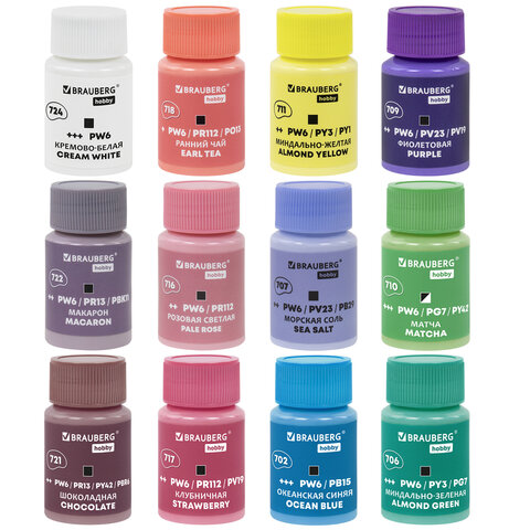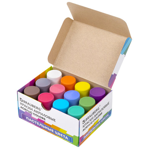 Краски акриловые художественные 12 ПАСТЕЛЬНЫХ цветов в банках по 22 мл, BRAUBERG HOBBY, 192411
