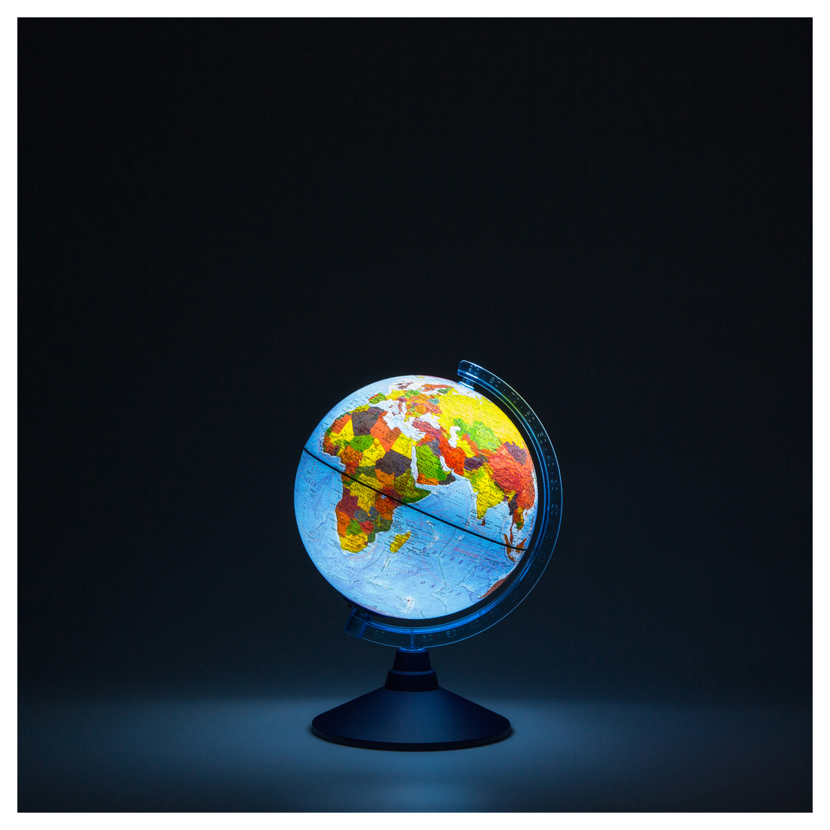 Глобус включает в себя две карты: с выключенной подсветкой вы видите физическую карту мира, при включении подсветки – политическую карту мира. Это делает глобус практичным и долговечным в использовании – пригодится школьнику для изучения окружающего мира, географии, истории и экономики. Компактный размер глобуса 21 см удобен для размещения на рабочем столе. Карта глобуса максимально подробная, все надписи легко читаются. Глобус имеет подсветку, что позволяет комфортно использовать его в темное время суток. Подсветка от батареек абсолютно безопасна – можно использовать глобус в качестве ночника. Подсветка работает от двух батареек АА, в комплект с глобусом не входят. Использованные батарейки внутри сферы при необходимости легко заменить. Глобус выполнен из прочного высококачественного пластика с соблюдением всех современных технологий. Упакован в фирменную подарочную коробку.