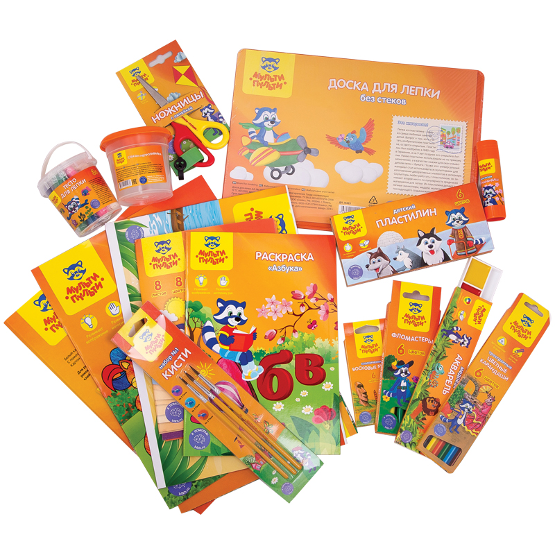 В состав набора вошли лучшие продукты «Мульти-Пульти»: Набор принадлежностей для творчества Мульти-Пульти - отличный подарок юному художнику. Он содержит все необходимые материалы для занятий творчнством. Яркий дизайн обязательно привлечет внимание ребенка! В состав набора вошли лучшие продукты Мульти-Пульти: альбом для рисования, цветной картон А4, цветная бумага A4, клей-карандаш, раскраска пластилином, доска для лепки, пластилин, мелки пластиковые, карандаши цветные, карандаш чернографитный (2 шт.), набор кистей, акварель, ножницы детские, фломастеры, ластик, глазки декоративные, набор для творчества «Игрушка из бумажного пакета».