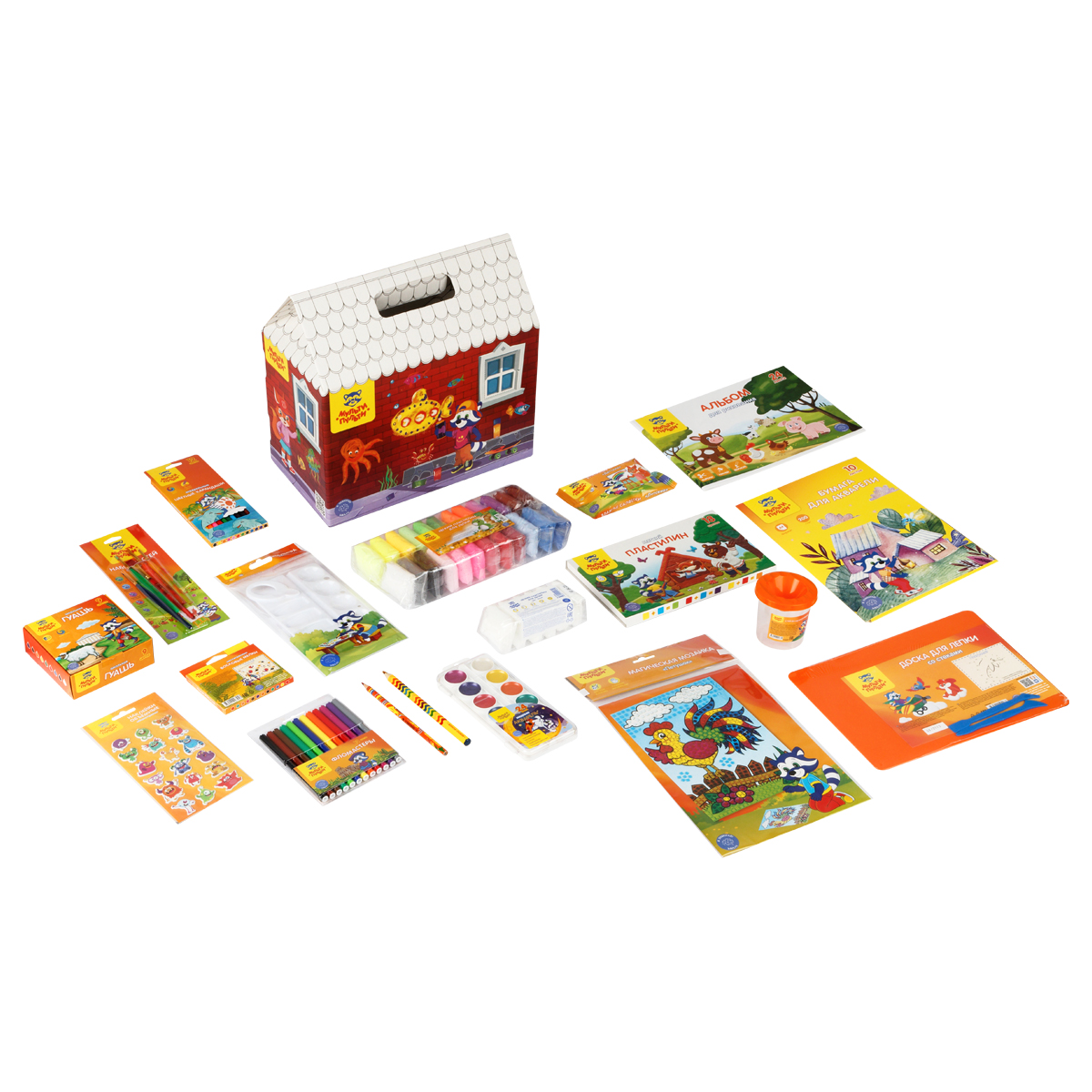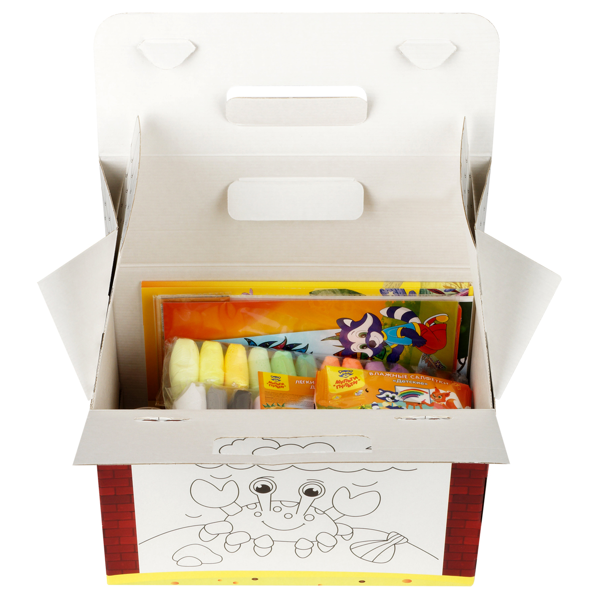 Набор принадлежностей для рисования и творчества «Мульти-Пульти» из серии «Набор принадлежностей для творчества» – отличный подарок юному художнику. Он содержит все необходимое для занятий творчеством и состоит из 19 предметов, размер коробки – 34*33*18 см. НАПОЛНЕНИЕ НАБОРА Карандаши акварельные 12 цветов; Мелки восковые 12 цветов; Стакан-непроливайка; Палитра художника; Набор для лепки; Гуашь 9 цветов; Акварель 24 цвета; Пластилин 18 цветов; Папка для акварели, 10л., А4; Набор кистей 5 штук; Легкий пластилин для лепки белый; Легкий пластилин для лепки цветной 24 цвета; Альбом для рисования 24листа, А4, на скрепке; Мозаика магическая на самоклеящейся основе; Фломастеры 12цветов; Карандаш с многоцветным грифелем; Карандаш с многоцветным грифелем утолщённый; Наклейки объемные; Салфетки влажные детские 20 штук.
