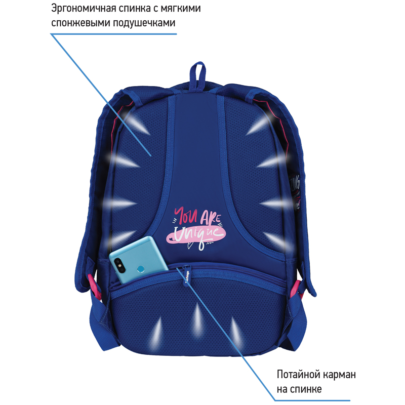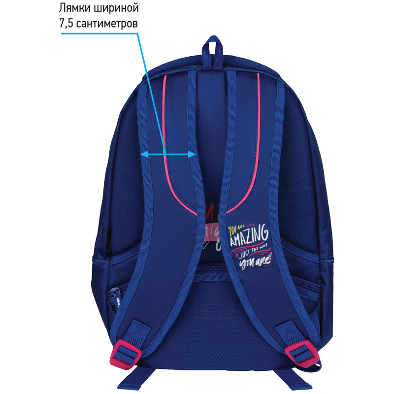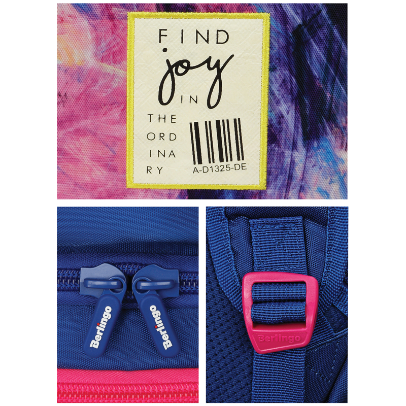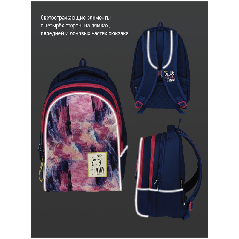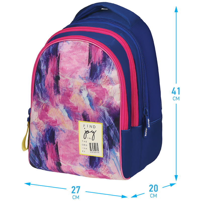 Эргономичный рюкзак школьный для девочки Berlingo серии in-Style Joy размера 41*27*20 см предназначен для детей среднего и старшего школьного возраста. В модели предусмотрены 3 отделения, есть потайной карман на молнии на спинке. Внутри имеется органайзер, 2 открытых кармана, 1 карман на резинке и карман на молнии. Рюкзак выполнен из прочного нейлона, благодаря чему изделия обладают повышенной износостойкостью. Объём – 22 литра. Эргономичная вентилируемая спинка, широкие регулируемые лямки помогают равномерному распределению нагрузки на позвоночник, а усиленное дно, плотная ручка и петля для подвешивания делают рюкзак максимально удобным. Внутренняя подкладка плотная и устойчивая к разрывам. Световозвращающие элементы обеспечивают безопасность в темное время суток. Вес изделия 800 граммов. • Размер: 41*27*20 см; • Количество отделений: 3; • Объём: 22 л.; • Вид спинки: эргономичная; • Возрастная группа: для средних и старших классов.