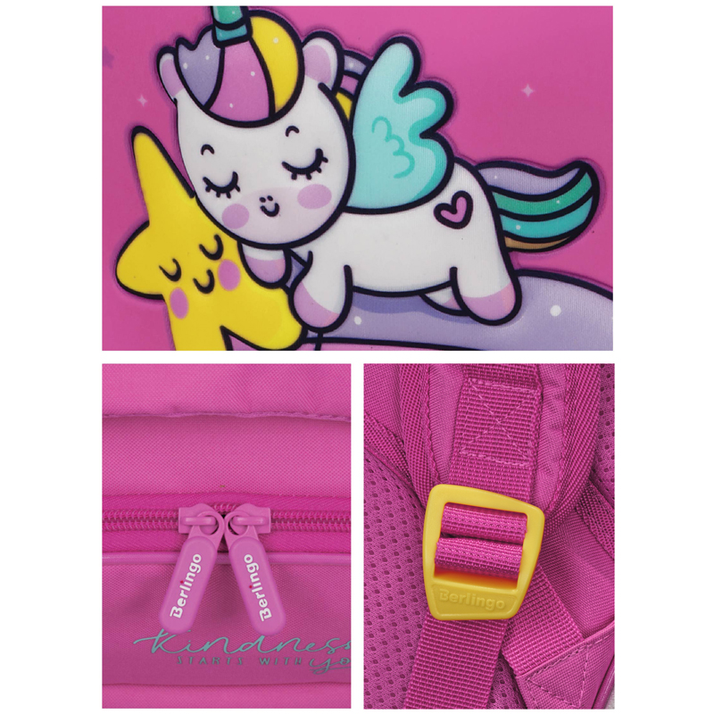 Детский рюкзак для девочки Berlingo Kids Unistar размера 36*27*12 см идеально подходит для посещения кружков и развивающих занятий. У модели объёмом 11,5 литров 1 основное отделение, 2 боковых кармана и 1 передний карман на молнии с выпуклым 3Д героем. Внутри есть 1 карман на резинке, 1 карман на молнии и 1 открытый карман. Вес менее 610 грамм. Эргономичная вентилируемая спинка, широкие регулируемые лямки и нагрудное крепление обеспечивают плотную фиксацию и равномерное распределение нагрузки на позвоночник, а усиленное дно, плотная ручка и петля для подвешивания делают рюкзак максимально удобным. Световозвращающие элементы располагаются с 4-х сторон рюкзака. Световой LED кант вокруг переднего кармана работает в нескольких режимах и может переключаться специальным пультом. Яркое свечение обязательно понравится детям и обеспечит их видимость в темное время суток. • Размер: 36*27*12 см; • Количество отделений: 1; • Объём: 11,5 л.; • Вид спинки: эргономичная; • Возрастная группа: дошкольники и младшие школьники.