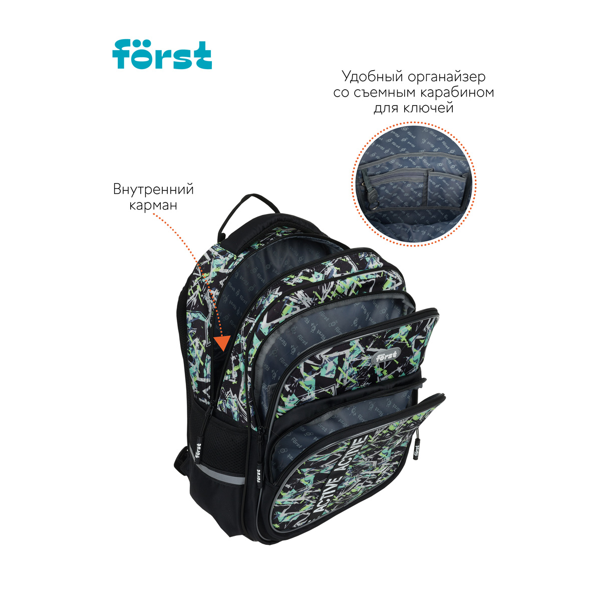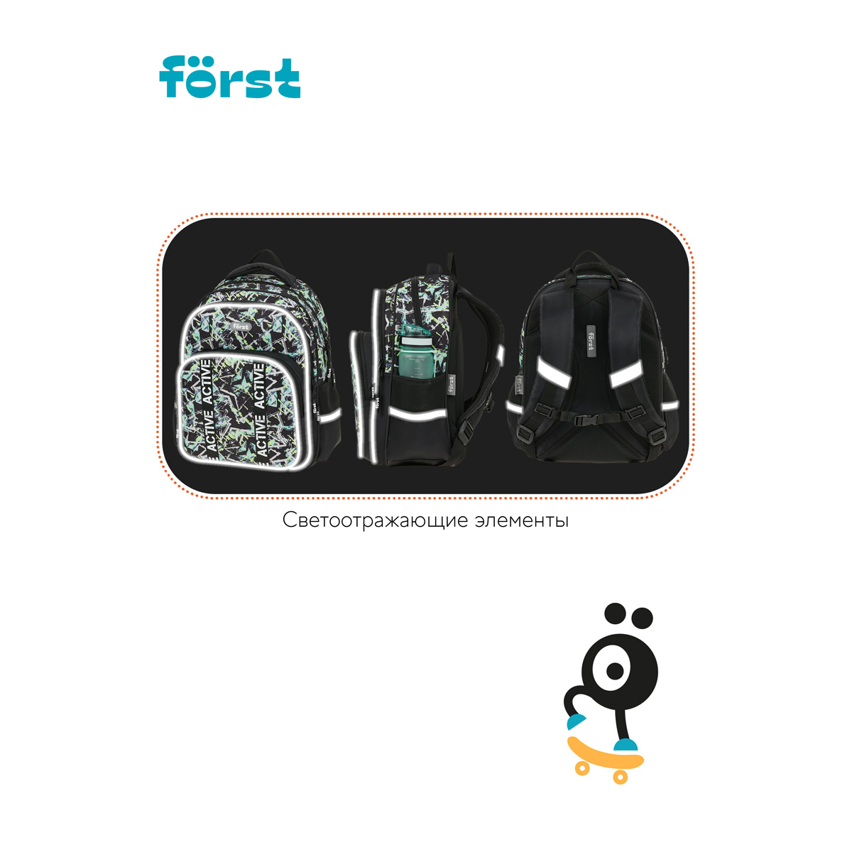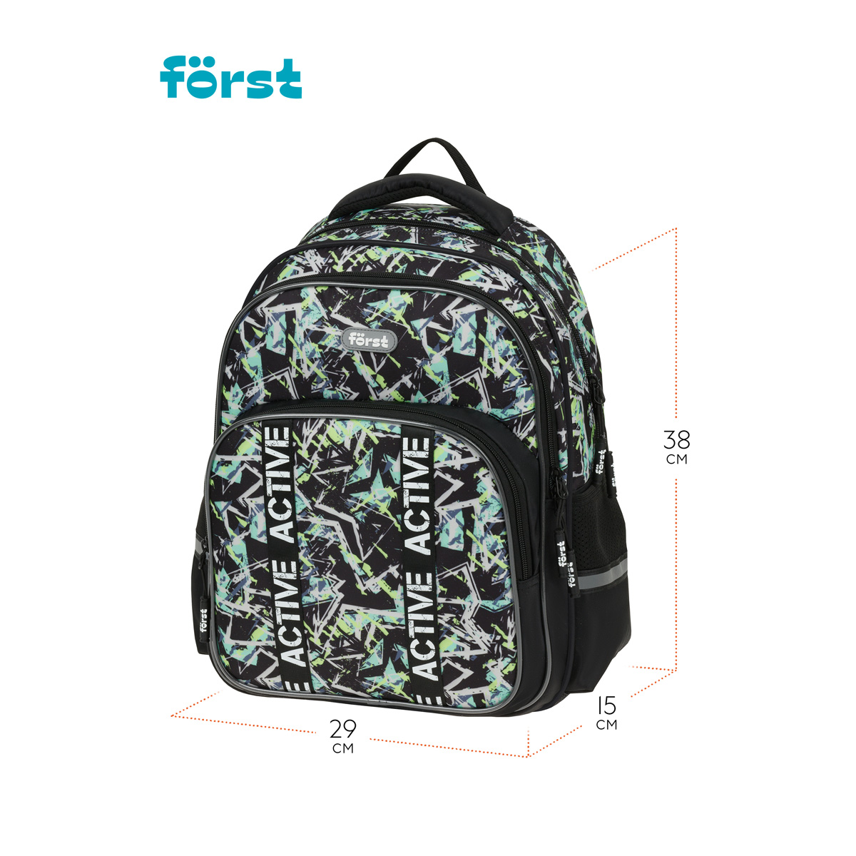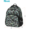 Рюкзак Först F-COMFY Abstract размером 38*29*15 см и объёмом 16,5 литра с двумя отделениями, тремя карманами для детей младшего и среднего школьного возраста. Внутри — органайзер для канцтоваров и съемный карабин для ключей. Жесткая эргономичная спинка равномерно распределяет нагрузку без вреда для осанки. Спонжевые вставки, покрытые мягким вентиляционным материалом, обеспечивают комфорт, а также предотвращают запотевание спины ребенка. Дно рюкзака покрыто водонепроницаемым материалом для защиты содержимого от влаги и легкого ухода за изделием. Светоотражающие элементы — для безопасного передвижения ребенка в темное время суток. • Размер изделия: 38*29*15 см; • Вес: 690 г; • Объём: 16,5 литра; • Возрастная группа: для младших и средних классов.