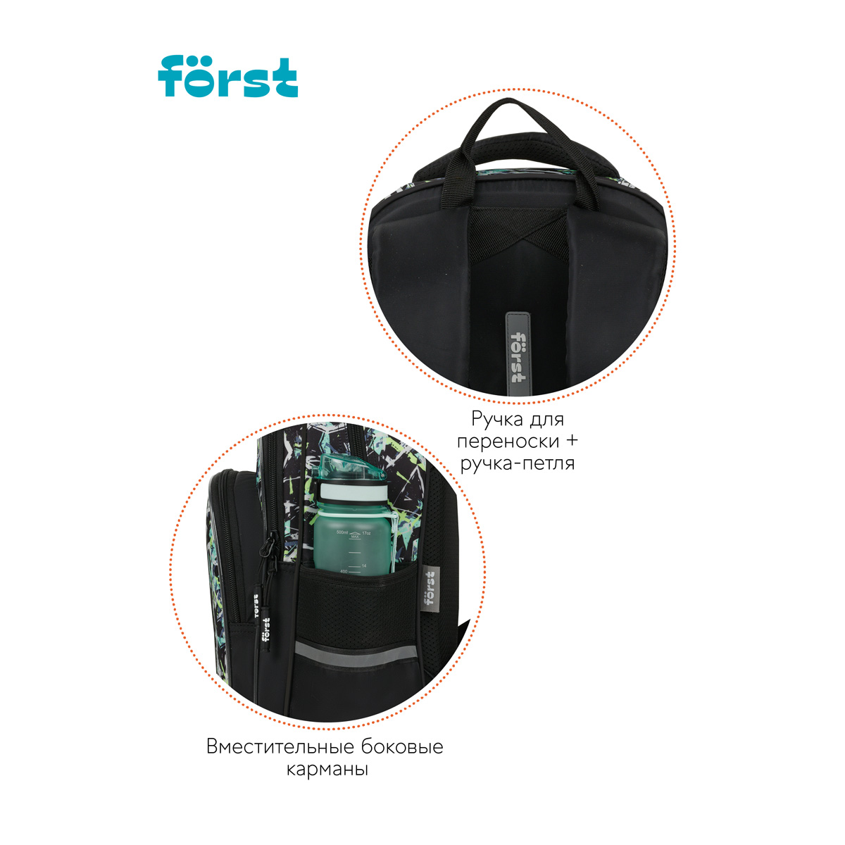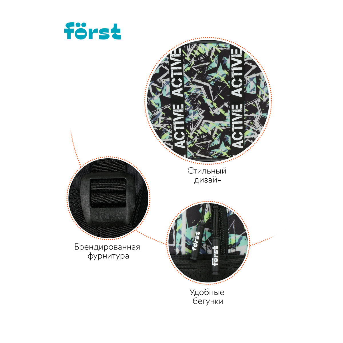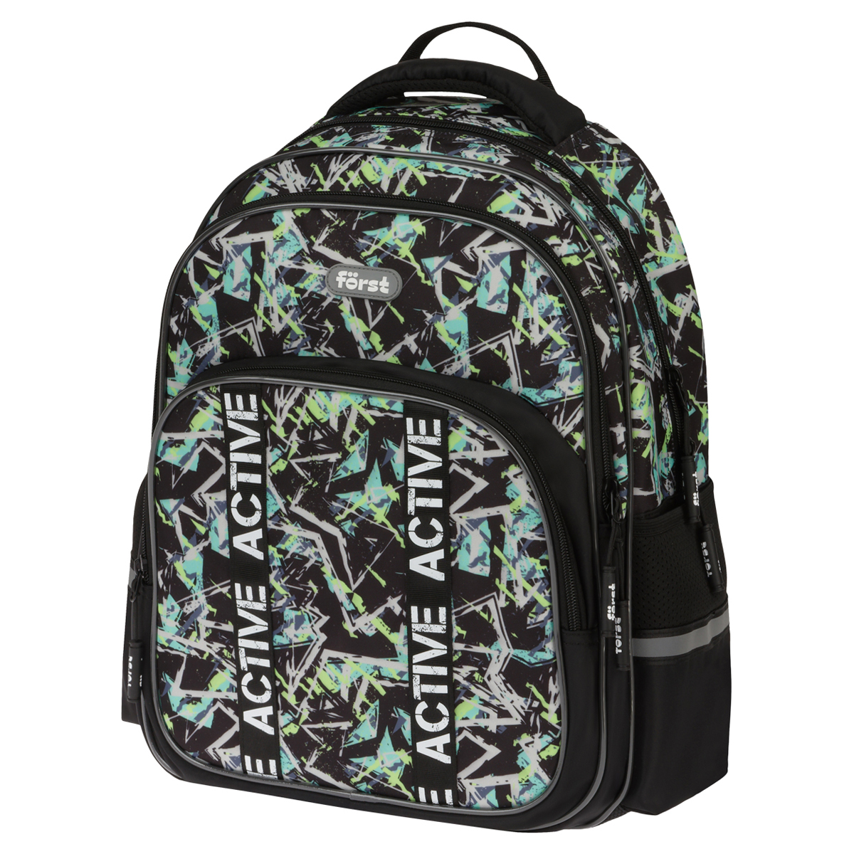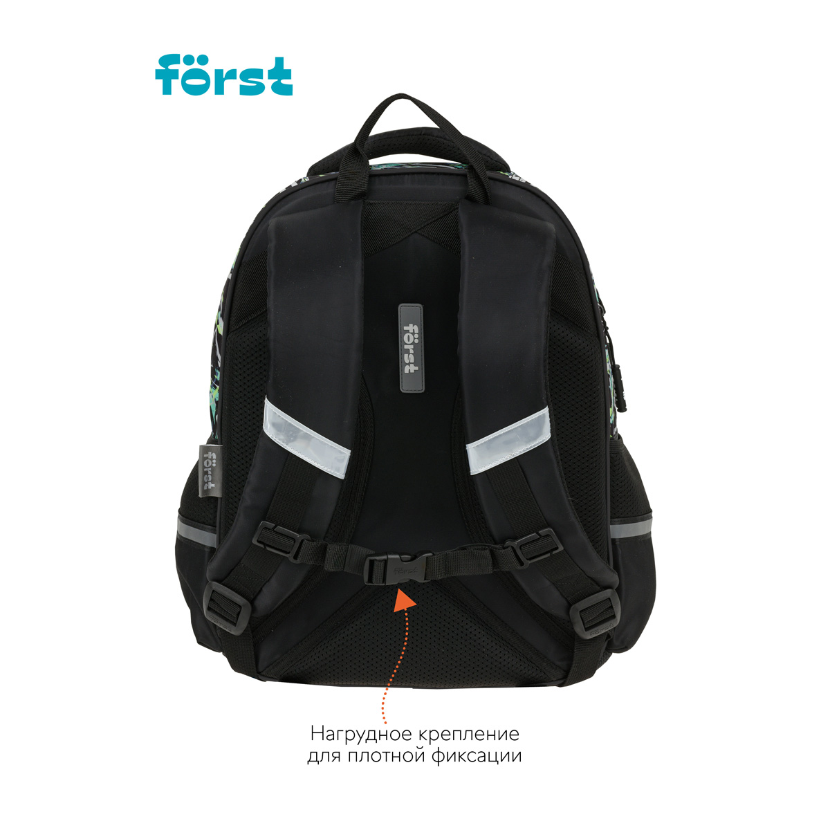 Рюкзак Först F-COMFY Abstract размером 38*29*15 см и объёмом 16,5 литра с двумя отделениями, тремя карманами для детей младшего и среднего школьного возраста. Внутри — органайзер для канцтоваров и съемный карабин для ключей. Жесткая эргономичная спинка равномерно распределяет нагрузку без вреда для осанки. Спонжевые вставки, покрытые мягким вентиляционным материалом, обеспечивают комфорт, а также предотвращают запотевание спины ребенка. Дно рюкзака покрыто водонепроницаемым материалом для защиты содержимого от влаги и легкого ухода за изделием. Светоотражающие элементы — для безопасного передвижения ребенка в темное время суток. • Размер изделия: 38*29*15 см; • Вес: 690 г; • Объём: 16,5 литра; • Возрастная группа: для младших и средних классов.