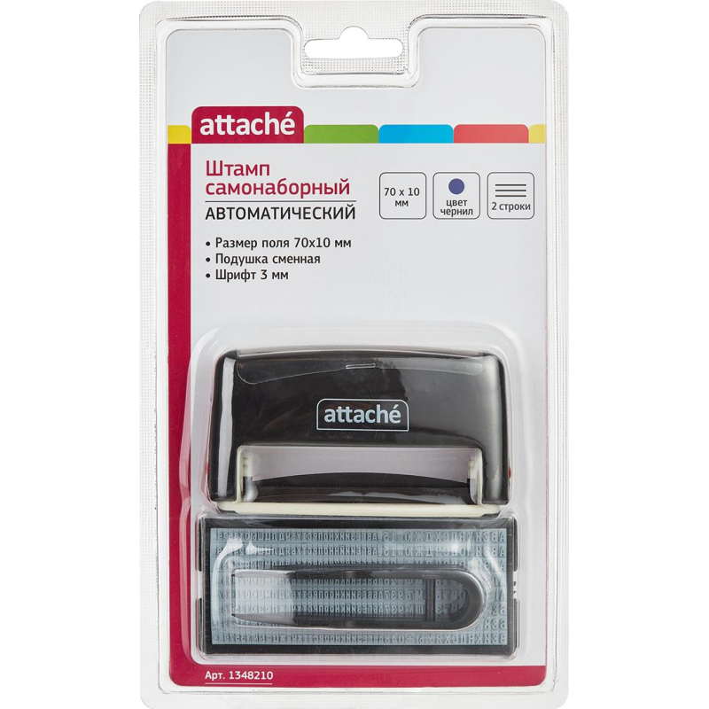 Штамп самонаборный Attache предназначен для самостоятельного создания и изменения текста оттиска. Компактный и надежный пластиковый корпус с автоматическим поворотным окрашивающим механизмом. На корпусе расположено информационное окно для корпоративной или личной персонализации. Легкая и чистая замена штемпельной подушки. Оптимальный набор букв, цифр и символов на двух ножках. Размер поля - 70x10 мм, 2 строки. Максимальное количество знаков в каждой строке - 35 основным шрифтом. Комплектация: штамп с рифленой пластиной для набора; одна касса букв: русские буквы, цифры, символы, 3 мм х 360 знаков; синяя сменная штемпельная подушка, пинцет. Внимание! При использовании для набора текста широких символов (Ж, М, Ф, Ш, Щ, Ю, Ы), цифр, пробелов данные по максимальной вместимости символов будут снижаться. Также символы рекомендуется размещать с отступом от края (внутрь) в случае использования разных шрифтов.
