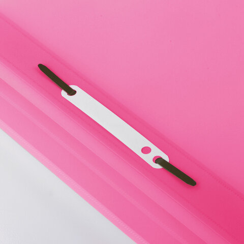 Фиксирует до 100 листов формата А4. Толщина пластика верхнего листа составляет 130 мкм, а нижнего - 180 мкм. Предельно простой механизм подшивки: металлические усики и пластиковая планка для надежной фиксации документов. Скоросшиватель изготовлен из качественного полипропилена. Прозрачный верхний лист позволяет определить содержимое, не открывая скоросшиватель, который к тому же снабжен сменным пластиковым корешком, что дает возможность структурировать информацию. Благодаря фактуре "песок" и яркому розовому цвету обложки ваша папка никогда не затеряется на полке.