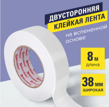 Клейкая двухсторонняя лента 38 мм х 8 м, НА ВСПЕНЕННОЙ ОСНОВЕ 1 мм, прочная, BRAUBERG, 606422
