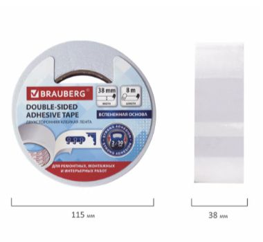 Двухсторонняя клейкая лента на вспененной основе BRAUBERG применяется для оформительских и ремонтных работ, крепления постеров, мелкой фурнитуры и т.д.
