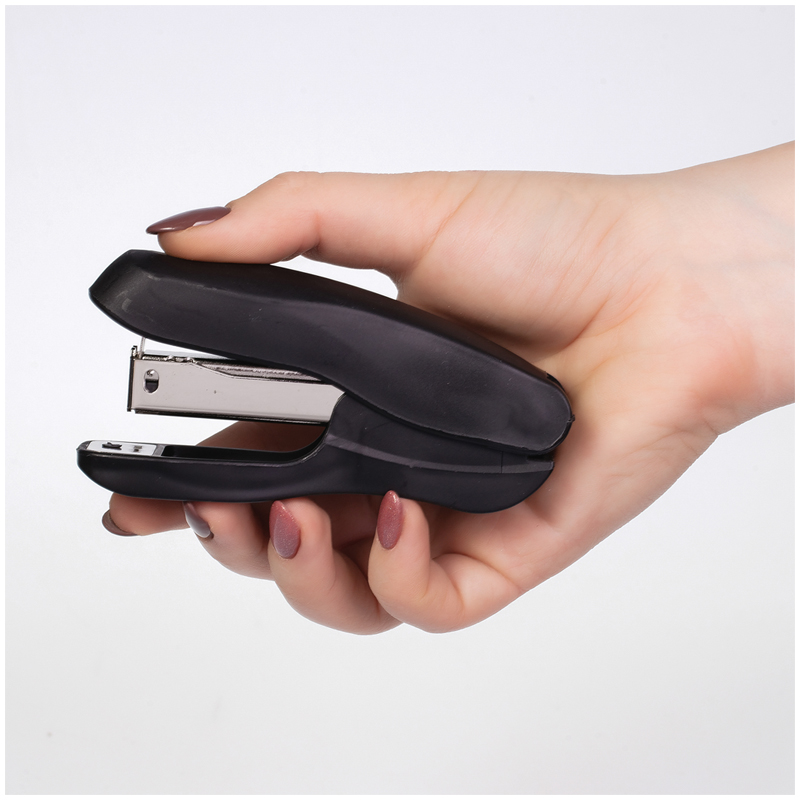 Удобный, пластиковый степлер для скоб №24, сшивает до 20 листов, вмещает 50 скоб. Пластиковый корпус, металлический механизм, цвет корпуса - черный.
