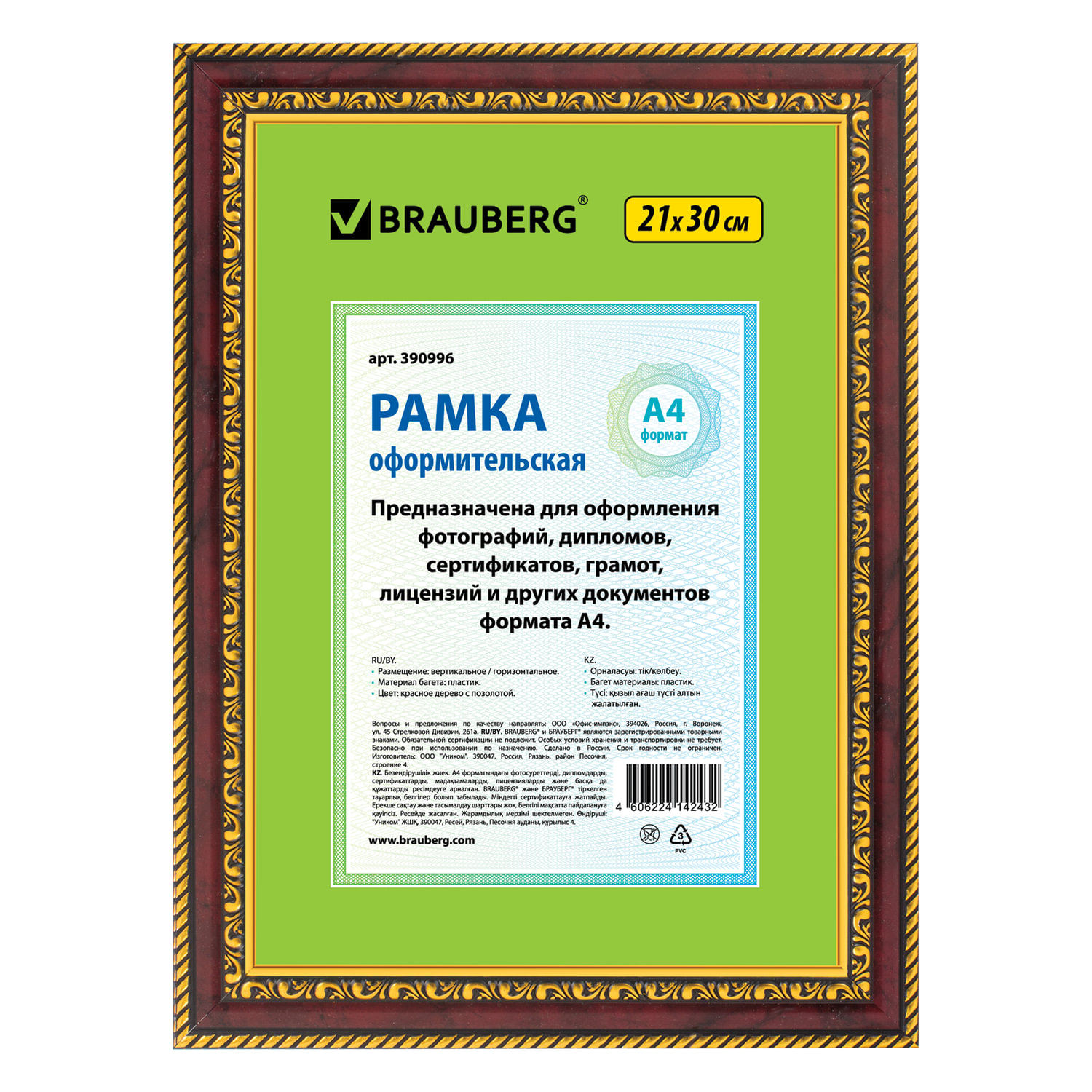 Рамка BRAUBERG "HIT4" для оформления фотографий, дипломов, сертификатов, грамот, лицензий и других документов формата А4 (21х30 см) будет гармонично смотреться в любом интерьере - дома и офисе, учебных учреждениях и магазинах, салонах и предприятий и др.