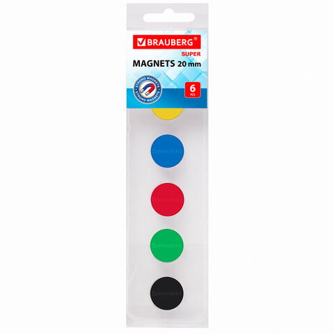 Магниты МОЩНЫЕ 20 мм (МАЛОГО ДИАМЕТРА), НАБОР 6 шт., ассорти, BRAUBERG "SUPER", 237477