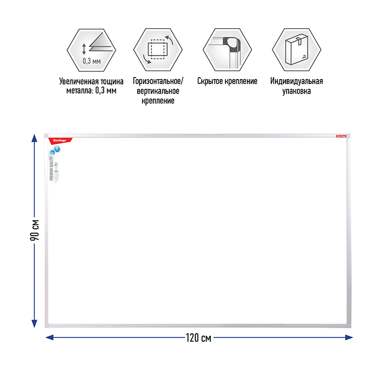Доска магнитно-маркерная Berlingo Premium качества, 90*120 см. Увеличеннная толщина магнитно-маркерной поверхности, ДВП основа. Полочка для аксессуаров и комплект креплений - в комплекте. Индивидульно упакована в пленку, в коробке - 1 штука. Гарантия на магнитно-маркерную поверхность - 10 лет.