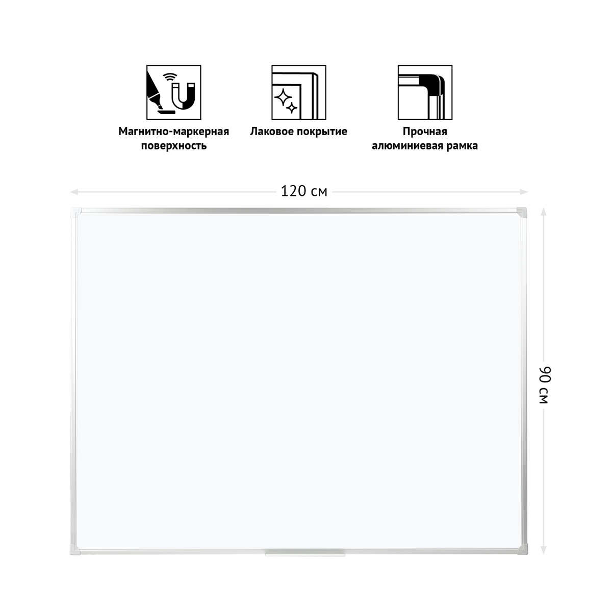 Доска магнитно-маркерная OfficeSpace в размере 90*120 см – отличное приобретение для офиса или школы. Вес нетто составляет 5 кг. Лакированная поверхность белого цвета подходит для письма сухостираемыми маркерами. Можно прикреплять информацию с помощью магнитов или немагнитной поверхности (меламин). В комплект входит полка для маркеров 30 см. Рамка изготовлена из анодированного алюминия с пластмассовыми уголками. Односторонняя доска представлена со скрытым креплением к стене в четырех углах, крепежные элементы прилагаются. • Покрытие рабочей поверхности: лаковое; • Материал рабочей поверхности: металл; • Цвет доски: белый; • Размер: 90*120 см; • Тип крепления: скрытое