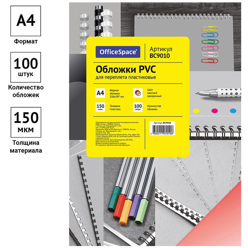 Обложка А4 OfficeSpace "PVC" 150мкм, прозрачный красный пластик, 100л. 233624