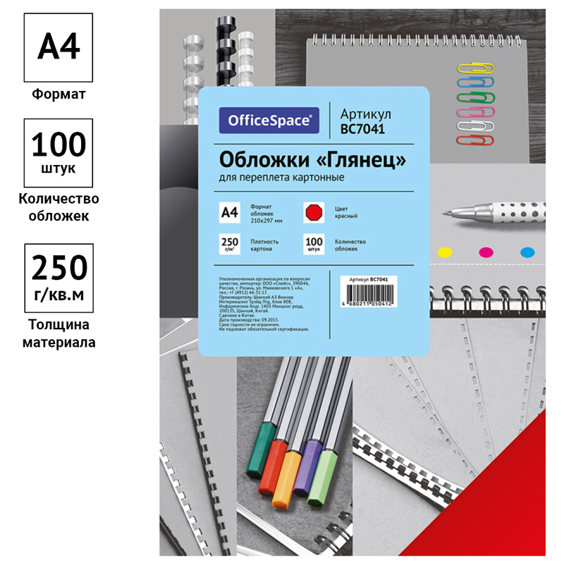 Обложка А4 OfficeSpace "Глянец" 250г/кв.м, красный картон, 100л. 222481