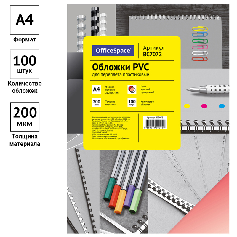 Обложка А4 OfficeSpace "PVC" 200мкм, прозрачный красный пластик, 100л. 222509