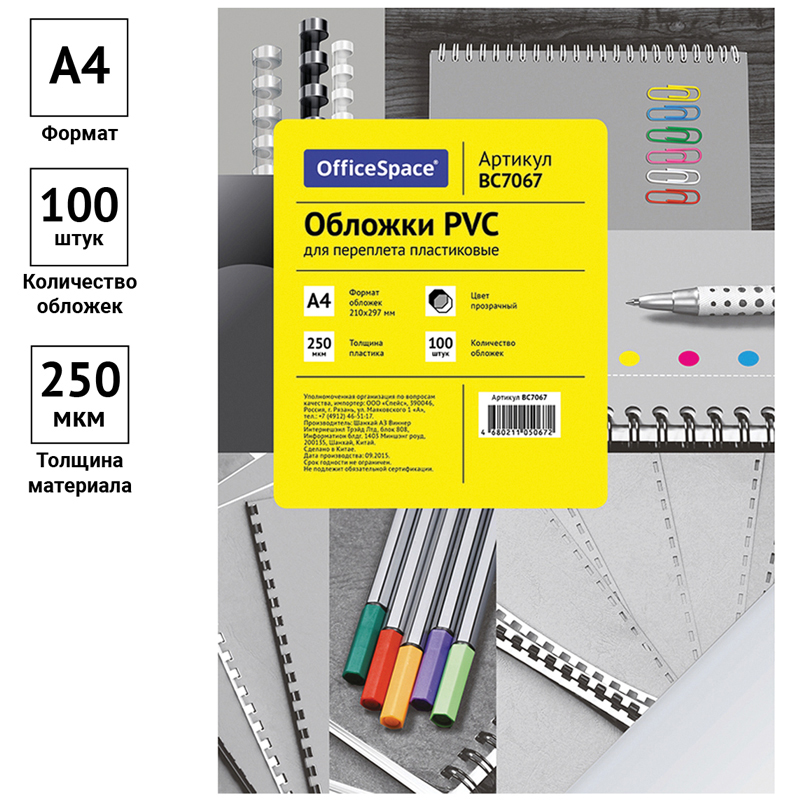 Обложка А4 OfficeSpace "PVC" 250мкм, прозрачный бесцветный пластик, 100л. 222511