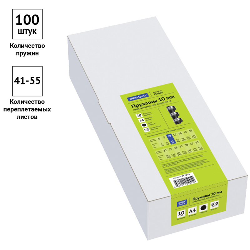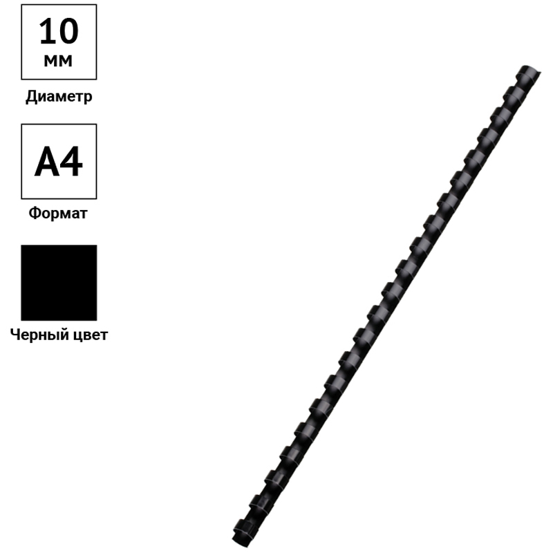 Пластиковые пружины OfficeSpace черного цвета диаметром 10мм предназначены для переплета документов. Легко выдерживают многократное раскрытие при необходимости добавить или удалить листы из готовой брошюры. Рекомендуемый объем брошюры при использовании данного диаметра пружины: 41-55 листов.
