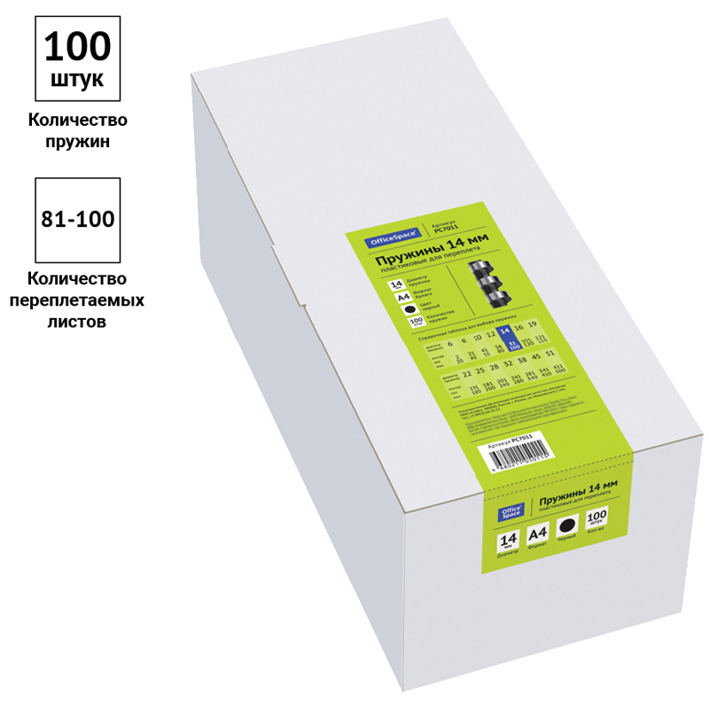 Пластиковые пружины OfficeSpace черного цвета диаметром 14мм предназначены для переплета документов. Легко выдерживают многократное раскрытие при необходимости добавить или удалить листы из готовой брошюры. Рекомендуемый объем брошюры при использовании данного диаметра пружины: 81-100 листов.