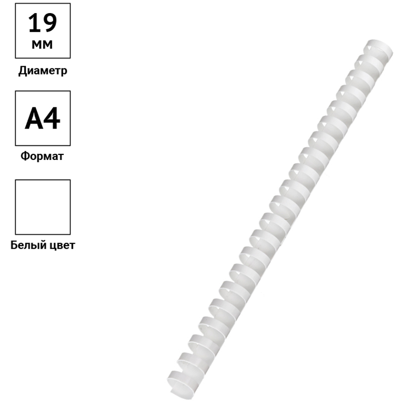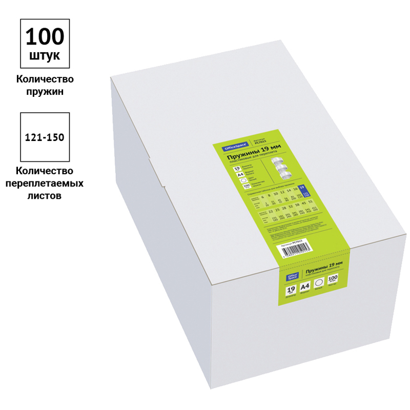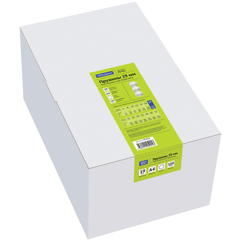 Пластиковые пружины OfficeSpace белого цвета диаметром 19мм предназначены для переплета документов. Легко выдерживают многократное раскрытие при необходимости добавить или удалить листы из готовой брошюры. Рекомендуемый объем брошюры при использовании данного диаметра пружины: 121-150 листов.