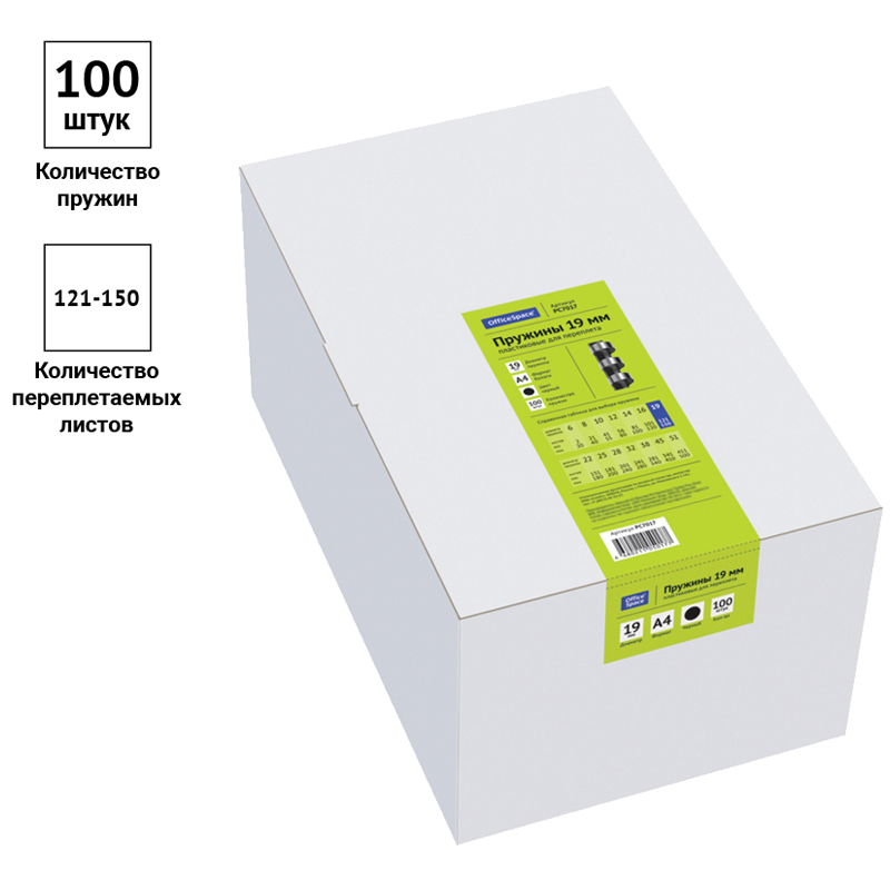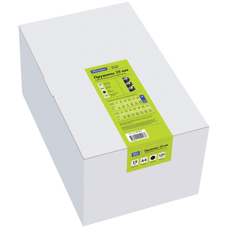 Пластиковые пружины OfficeSpace черного цвета диаметром 19мм предназначены для переплета документов. Легко выдерживают многократное раскрытие при необходимости добавить или удалить листы из готовой брошюры. Рекомендуемый объем брошюры при использовании данного диаметра пружины: 121-150 листов.