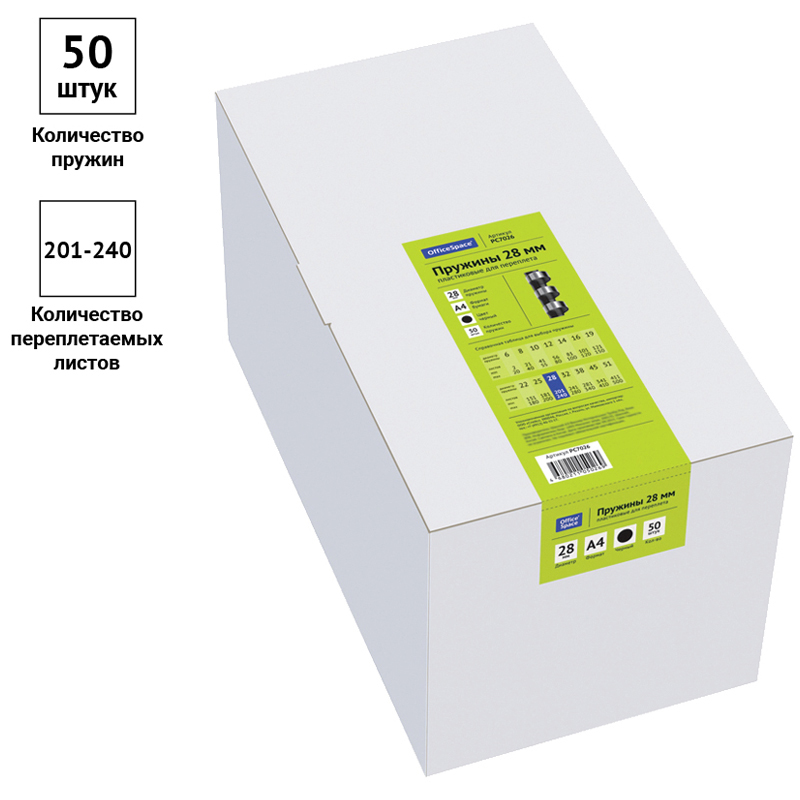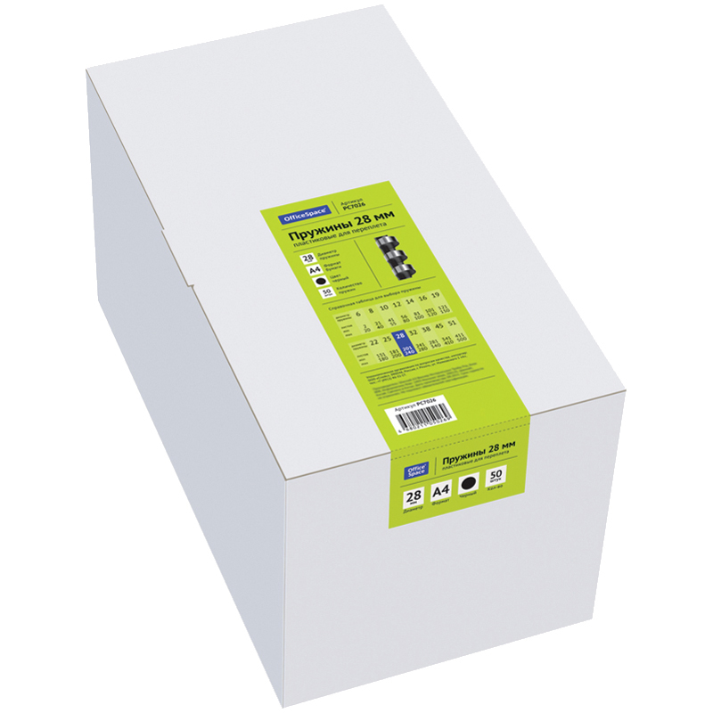 Пластиковые пружины OfficeSpace черного цвета диаметром 28мм предназначены для переплета документов. Легко выдерживают многократное раскрытие при необходимости добавить или удалить листы из готовой брошюры. Рекомендуемый объем брошюры при использовании данного диаметра пружины: 201-240 листов.