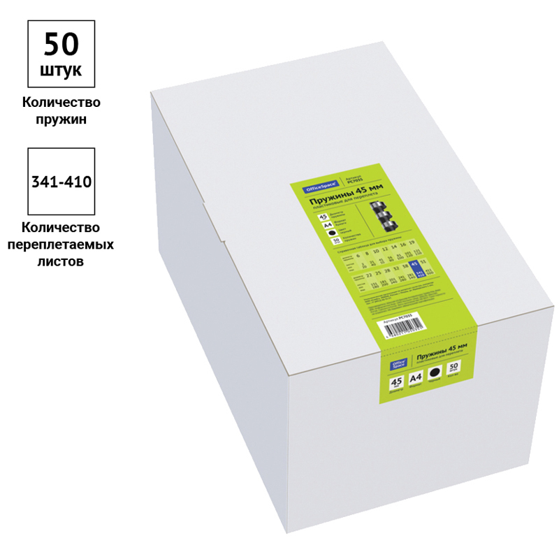 Пластиковые пружины OfficeSpace черного цвета диаметром 45мм предназначены для переплета документов. Легко выдерживают многократное раскрытие при необходимости добавить или удалить листы из готовой брошюры. Для надежной фиксации листов брошюры в пружине предусмотрены специальные блокирующие замки. Рекомендуемый объем брошюры при использовании данного диаметра пружины: 341-410 листов.