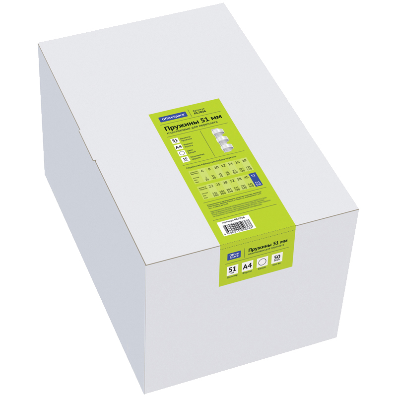Пластиковые пружины OfficeSpace белого цвета диаметром 51мм предназначены для переплета документов. Легко выдерживают многократное раскрытие при необходимости добавить или удалить листы из готовой брошюры. Для надежной фиксации листов брошюры в пружине предусмотрены специальные блокирующие замки. Рекомендуемый объем брошюры при использовании данного диаметра пружины: 411-500 листов.