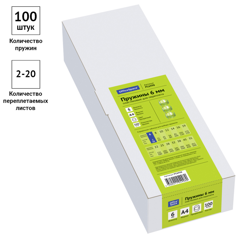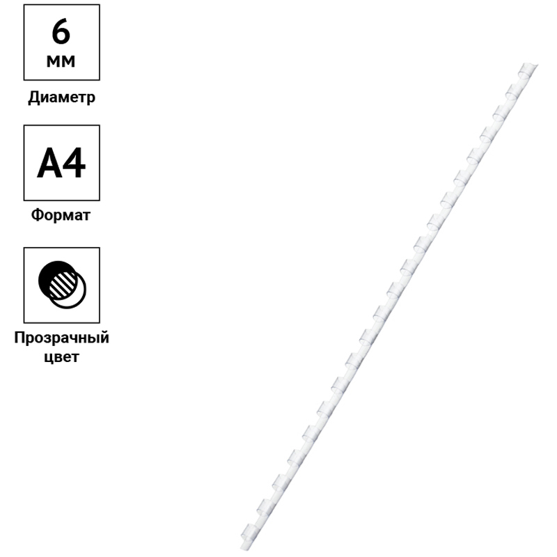 Пластиковые пружины OfficeSpace прозрачного цвета диаметром 6мм предназначены для переплета документов. Легко выдерживают многократное раскрытие при необходимости добавить или удалить листы из готовой брошюры. Рекомендуемый объем брошюры при использовании данного диаметра пружины: 2-20 листов.