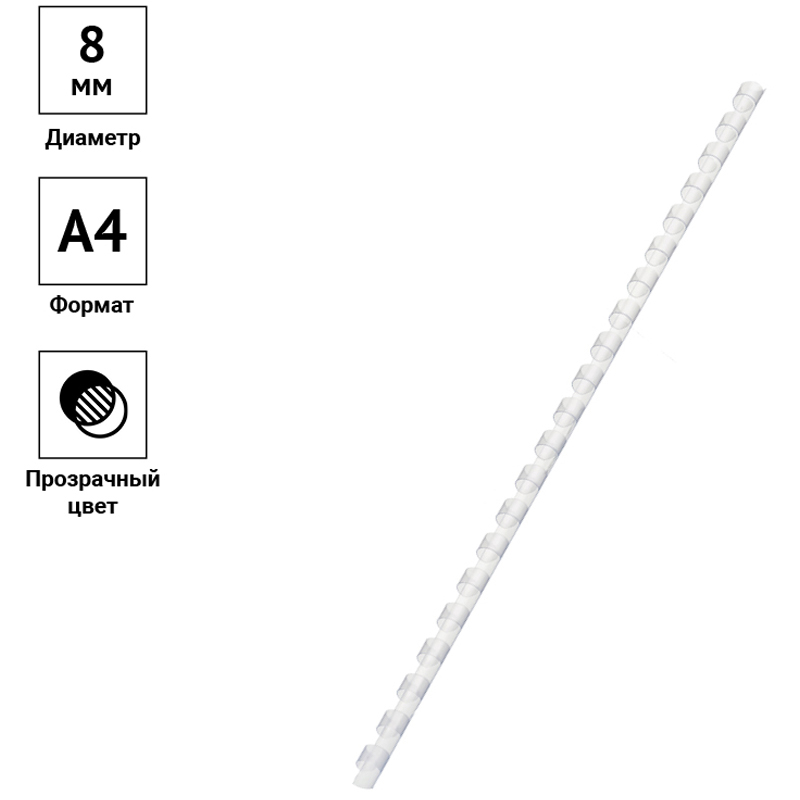 Пластиковые пружины OfficeSpace прозрачного цвета диаметром 8мм предназначены для переплета документов. Легко выдерживают многократное раскрытие при необходимости добавить или удалить листы из готовой брошюры. Рекомендуемый объем брошюры при использовании данного диаметра пружины: 21-40 листов.