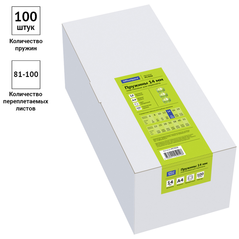 Пластиковые пружины OfficeSpace прозрачного цвета диаметром 14мм предназначены для переплета документов. Легко выдерживают многократное раскрытие при необходимости добавить или удалить листы из готовой брошюры. Рекомендуемый объем брошюры при использовании данного диаметра пружины: 81-100 листов.