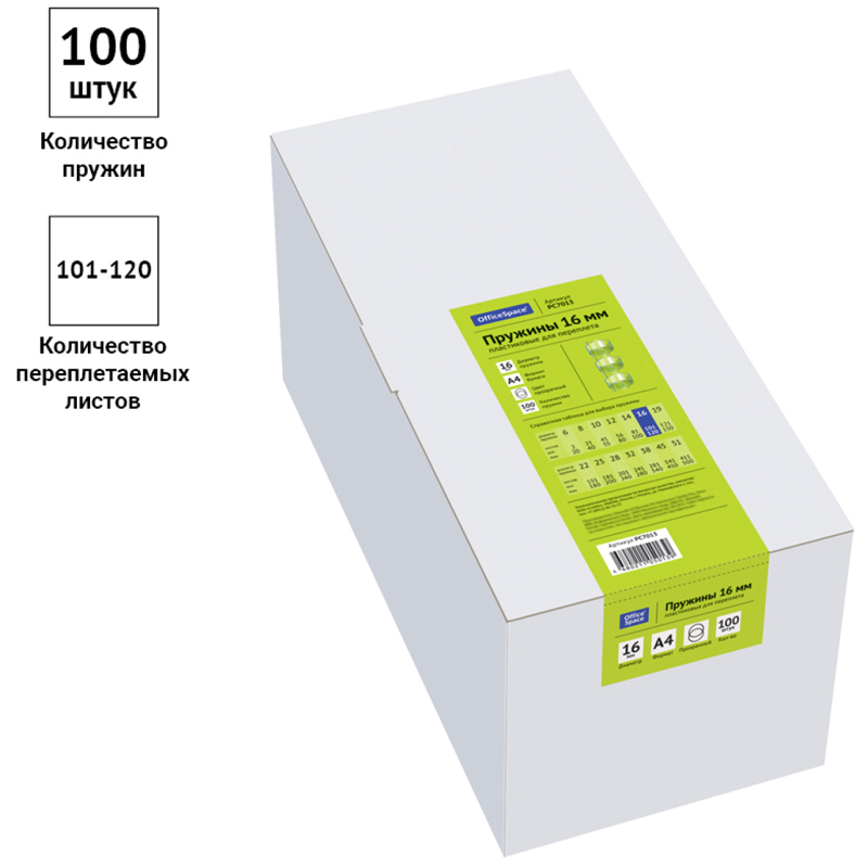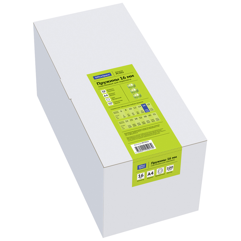 Пластиковые пружины OfficeSpace прозрачного цвета диаметром 16мм предназначены для переплета документов. Легко выдерживают многократное раскрытие при необходимости добавить или удалить листы из готовой брошюры. Рекомендуемый объем брошюры при использовании данного диаметра пружины: 101-120 листов.