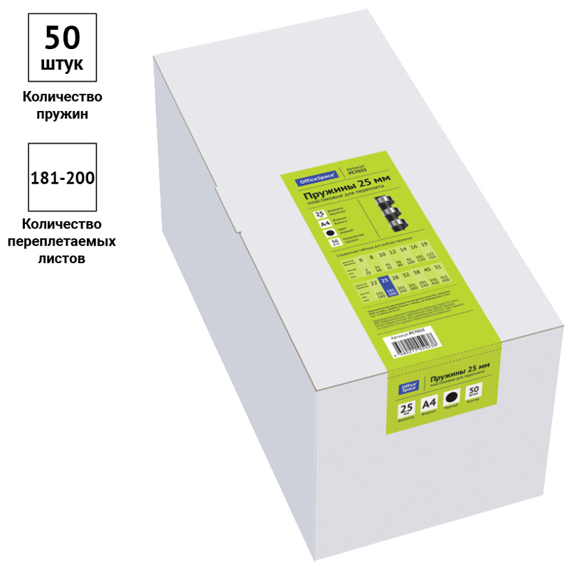 Пластиковые пружины OfficeSpace черного цвета диаметром 25мм предназначены для переплета документов. Легко выдерживают многократное раскрытие при необходимости добавить или удалить листы из готовой брошюры. Рекомендуемый объем брошюры при использовании данного диаметра пружины: 181-200 листов.