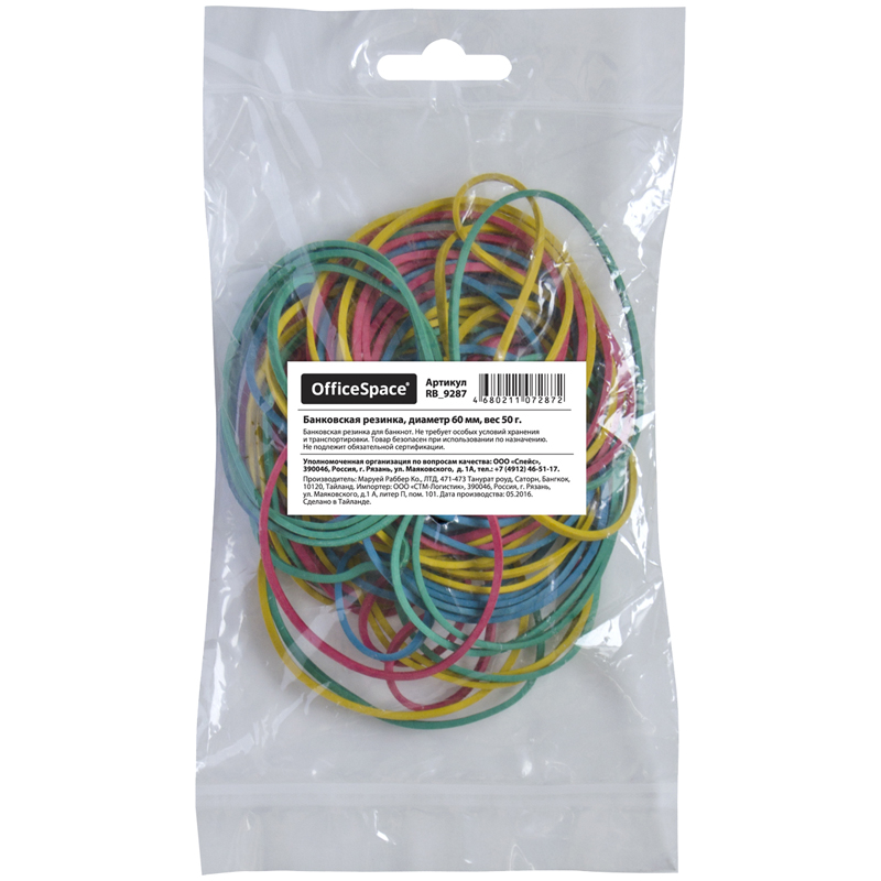 Банковская резинка 50г OfficeSpace, диаметр 60мм, RB_9287 ассорти, европодвес